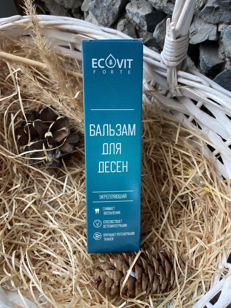 БАЛЬЗАМ ДЛЯ ДЕСЕН (Укрепляющий) 50 мл Эковит - концентрированный продукт для защиты полости рта, укрепления и регенерации структуры тканей десен. БАЛЬЗАМ созданный из природных экстрактов способных остановить воспалительные процессы. КАК ЭТО РАБОТАЕТ? Комплекс хвойных экстрактов пихты, кедра, сосны - способствует регенерации тканей полости рта за счет содержания: Флавоноидов и фитонцидов – природных антибиотиков, подавляющих развитие бактерий и прочих патогенов. Цинка, который в составе хвойных экстрактов способствует созданию новых клеток, заживлению ран, поддерживает функции иммунной системы, укрепляет кости. Ромашки, можжевельника, календулы и шалфея, содержат терпеновые и дубильные соединения, которые обладают обезболивающим, антисептическим свойством, способствуют снижению кровоточивости