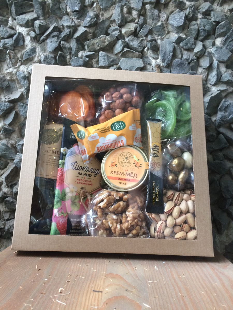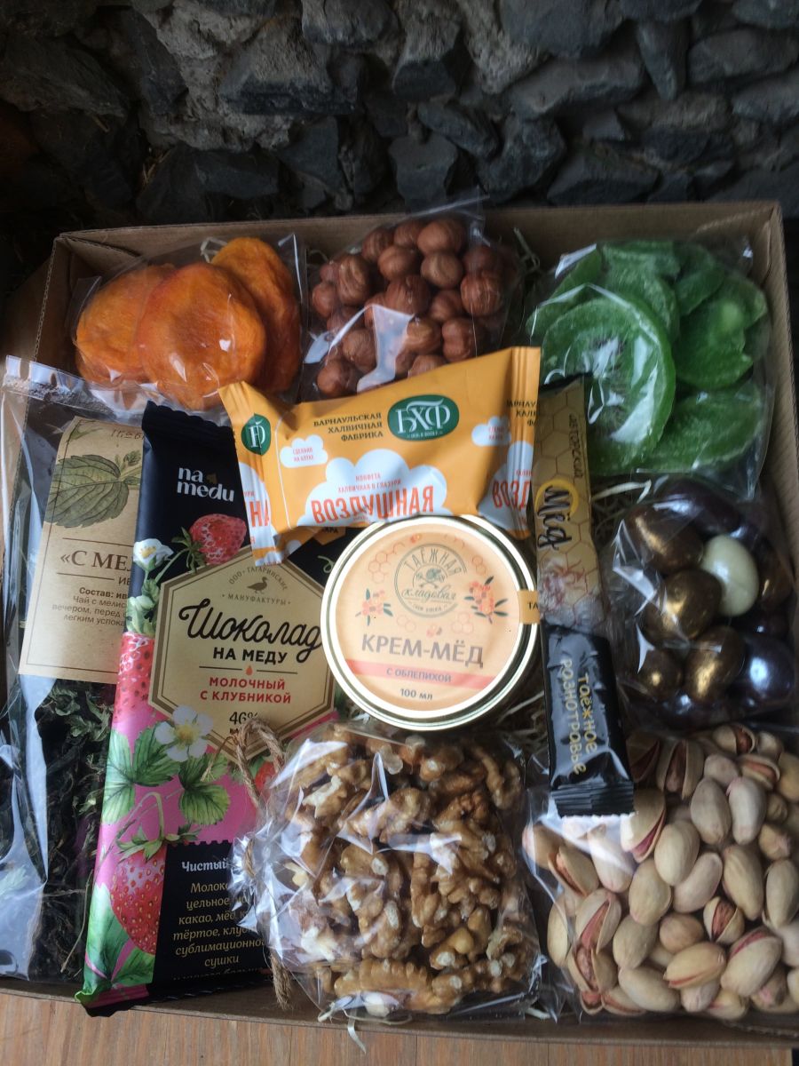 Грецкий орех; персик Армения; фундук; киви цукат; жемчуг 130гр; Иван чай с мелиссой 50гр; мёд порционный; Шоколад на меду» Молочный с клубникой»; крем мёд с облепихой; конфета воздушная халвичная;