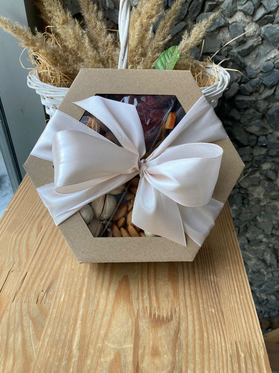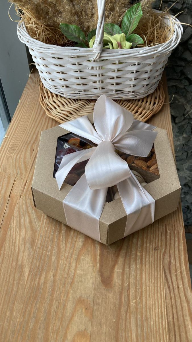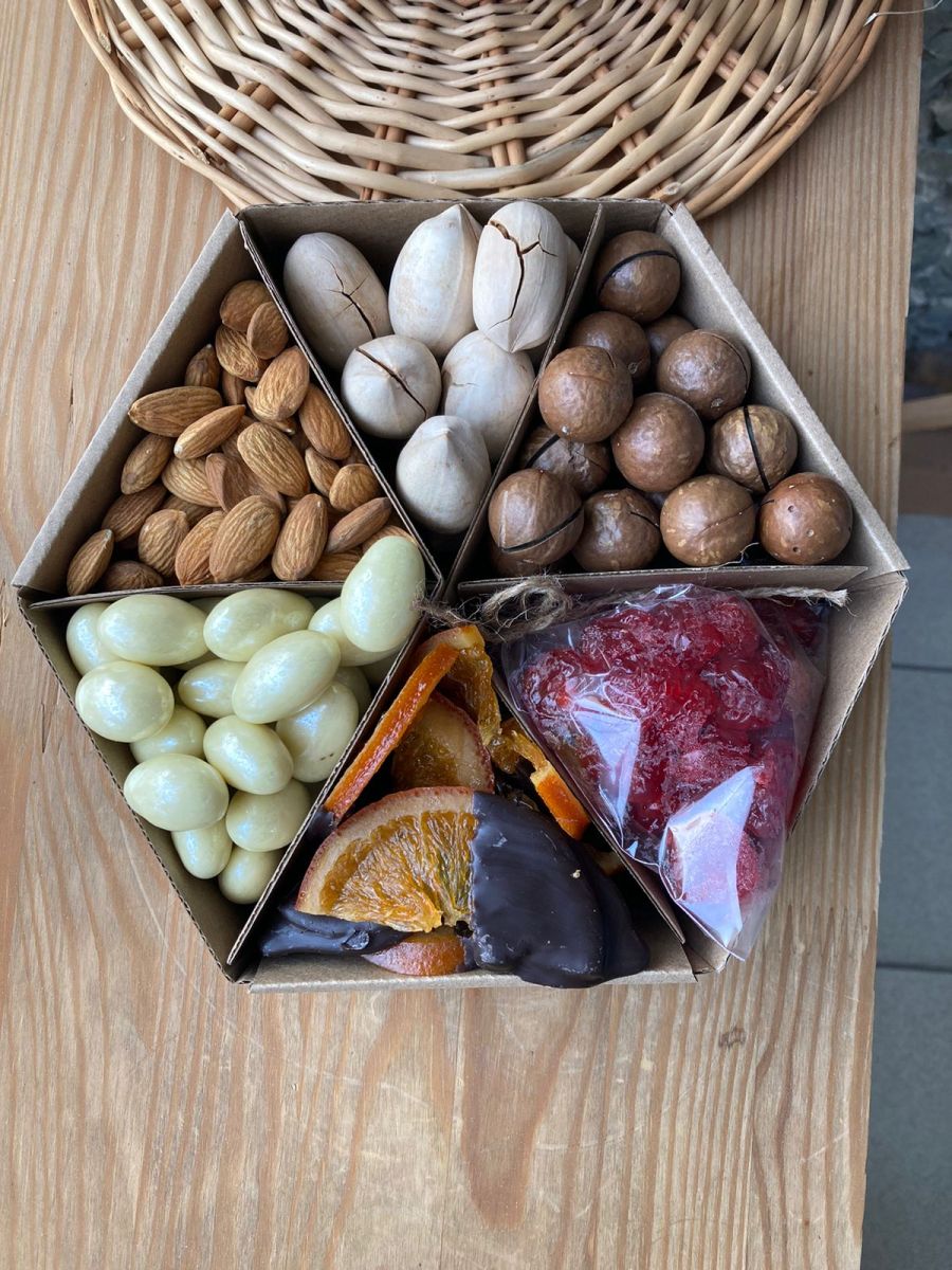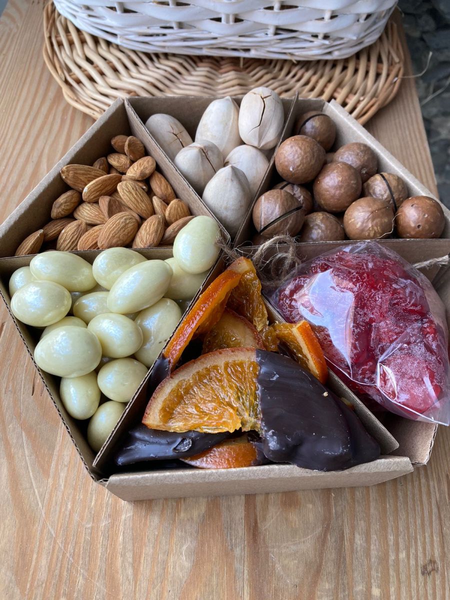 из наличия в момент сборки подарка цукаты: вишенка, клубничка, апельсин в шоколаде, манго в шоколаде, орех миндаль из Чили, миндаль или фундук в шоколаде и глазури, орех пееан десертный в скорлупке, макадамия + БАНТ