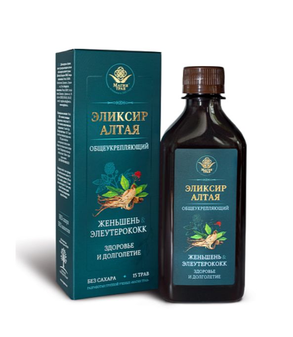 Эликсир Алтая общеукрепляющий – это эффективный комплекс иммуностимулирующих экстрактов женьшеня, элеутерококка, эхинацеи и других трав Алтая и Дальнего Востока, направленных на укрепление иммунитета и активацию жизненных сил. Не содержит сахара и алкоголя, поэтому имеет насыщенный, вяжущий вкус экстрактов трав. Эликсир Алтая общеукрепляющий улучшает обмен веществ, повышает защитные силы организма Разработан группой ученых компании «Магия Трав»: П.А. Луниным, К.П. Луниным и Н.П. Земцовой. Хранить при температуре не выше +25˚ С и влажности не более 75%. После вскрытия хранить в холодильнике не более 1 месяца. Перед употреблением взбалтывать. Возможно выпадение естественного осадка