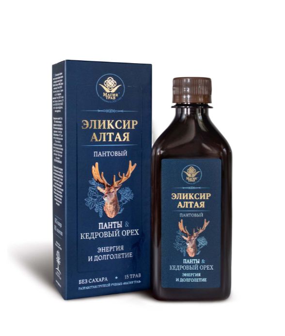Эликсир Алтая пантовый - это эффективный комплекс тонизирующих экстрактов из пантов марала, трав, плодов Алтая и Дальнего Востока, направленных на активацию жизненной энергии и повышения работоспособности. Не содержит сахара и алкоголя, поэтому имеет насыщенный, вяжущий вкус экстрактов трав. Разработан группой ученых компании «Магия Трав»: П.А. Луниным, К.П. Луниным и Н.П. Земцовой. Эликсир Алтая пантовый рекомендуется для стимуляции умственной, физической активности Хранить при температуре не выше +25˚ С и влажности не более 75%. После вскрытия хранить в холодильнике не более 1 месяца. Перед употреблением взбалтывать. Возможно выпадение естественного осадка