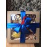 манго цукат, жемчуг (фундук/миндаль в шоколаде и глазури), орех макадамия и пекан в скорлупке, финик королевский, грецкие орешки в скорлупке, древесная стружка, коробка с окном и бант атласный цветом, под Ваши пожелания