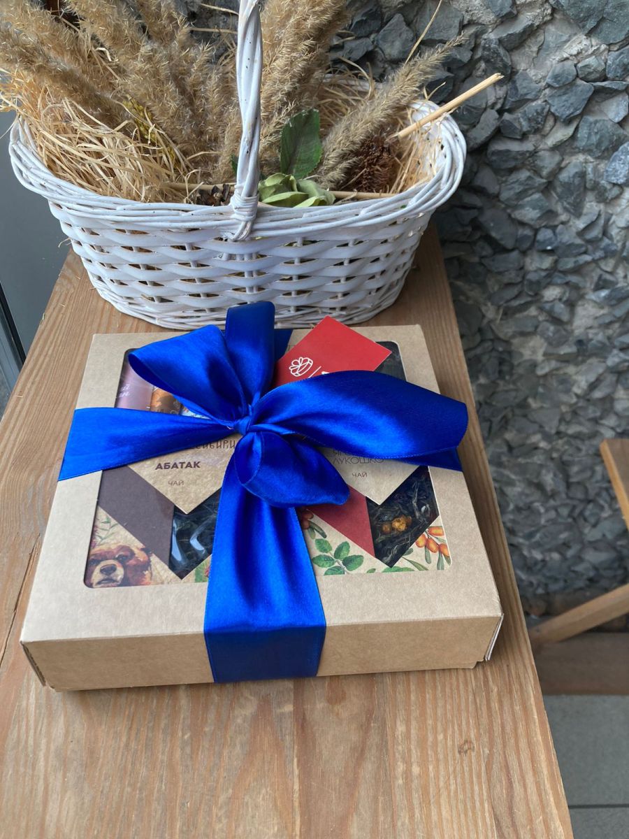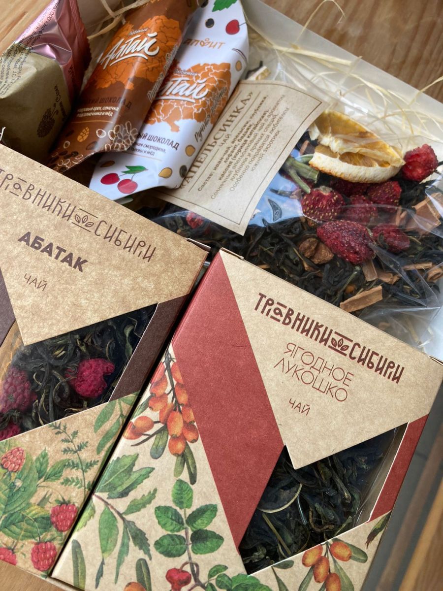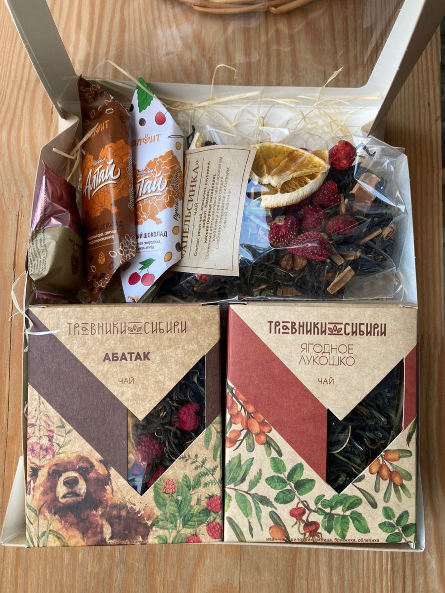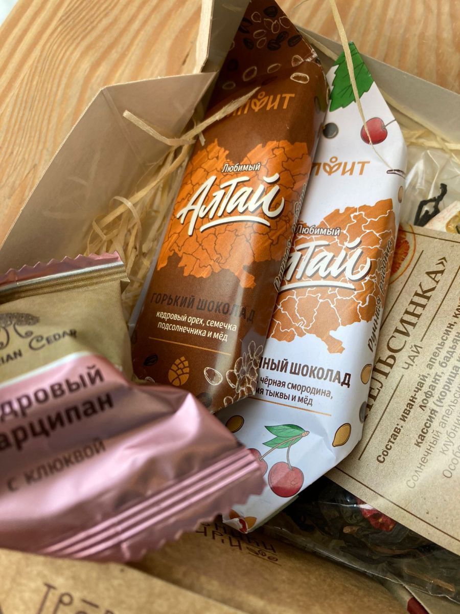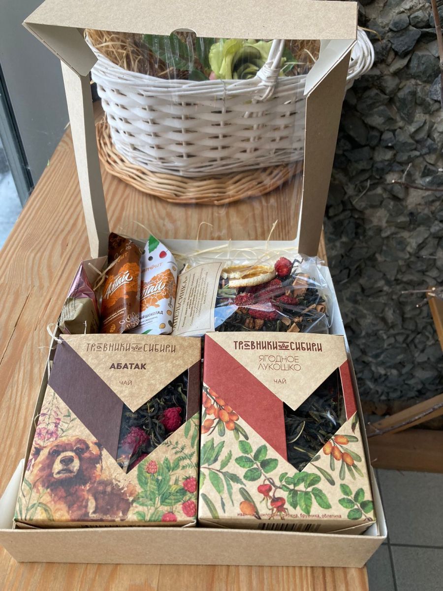 В состав набора входит: Вкусный и ароматный чай "Ягодное Лукошко", "Абатак" и "Апельсинка" от Травники Сибири Нежный кедровый марципан от Скедр Конфеты "Любимый Алтай" Состав примерный и может меняться исходя из предпочтения покупателя и цен продукции:) Цены и ассортимент меняются при индивидуальном наполнении заказа