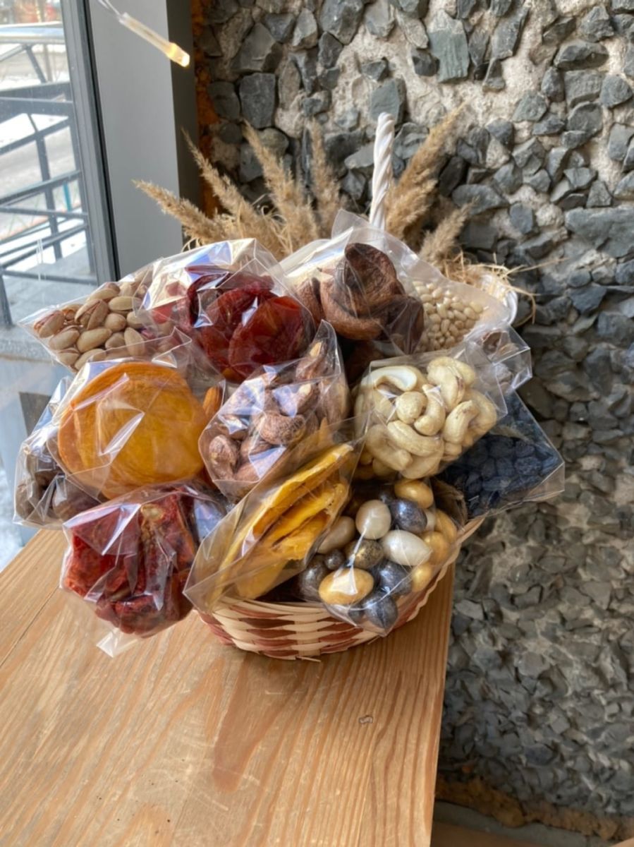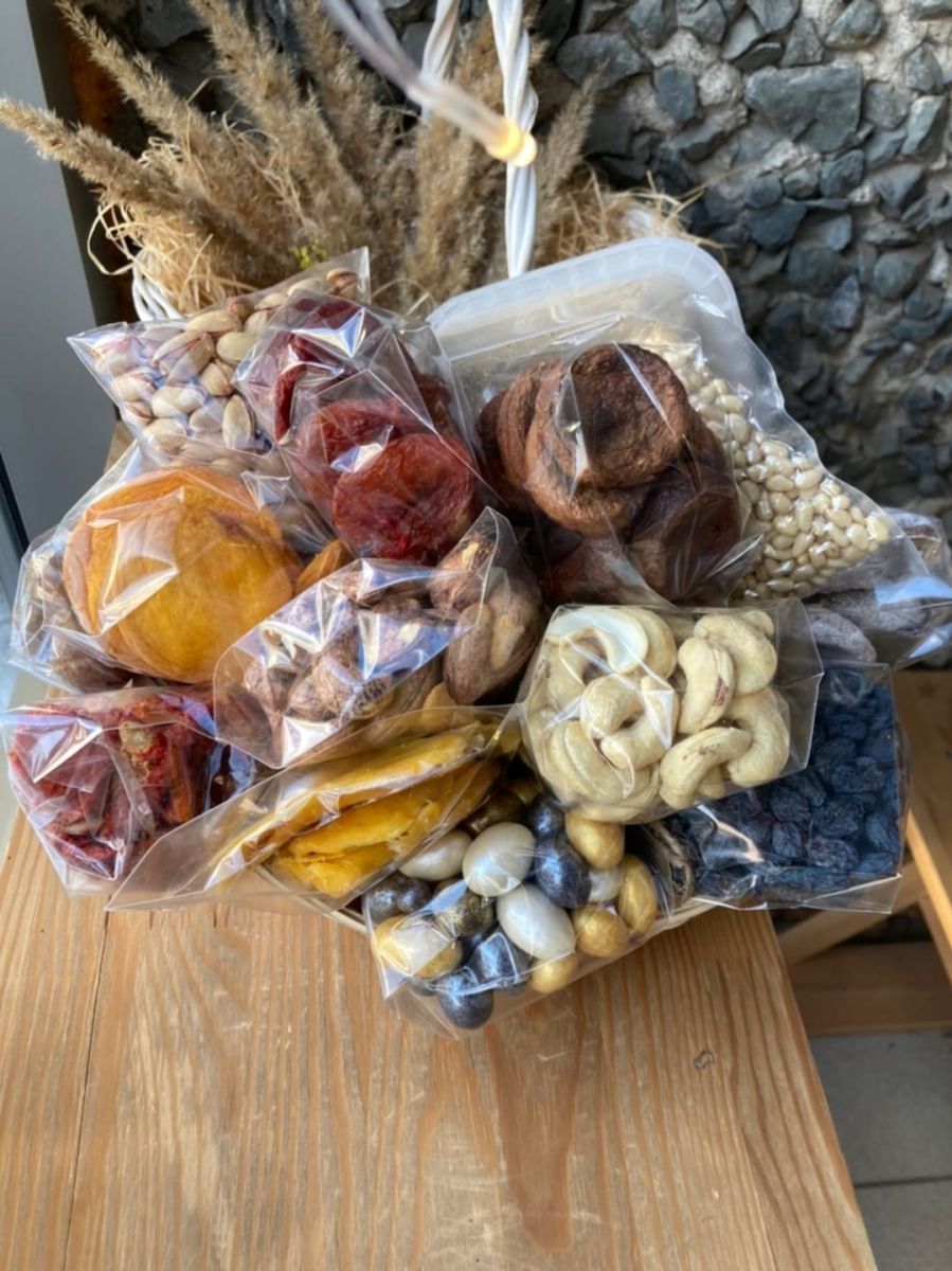 Состав: Грецкий орех Арахис в кокосе Фундук Иван чай Сибирячка Халва подсолнечная с курагой Крем мед Апельсин Финики Каспиан Фисташка Дыня сушеная Персик вяленый Памело цукат Ананас цукат Киви цукат Кешью Вишня цукат Клюква Кокос кубики Миндаль Чили Манго 5% сахара Орех грецкий в скорлупе Состав коробочки примерный и может меняться исходя из предпочтения покупателя и цен продукции:) Цены и ассортимент меняются при индивидуальном наполнении заказа