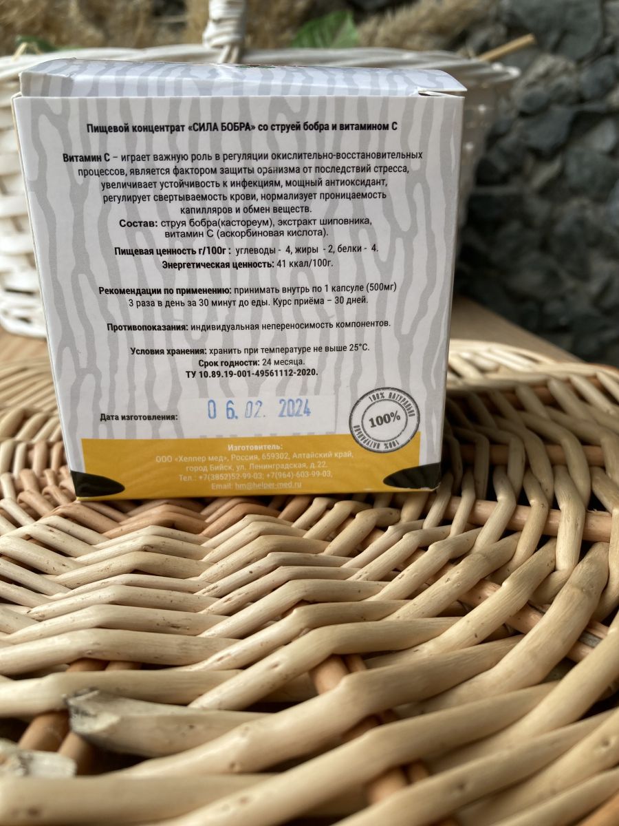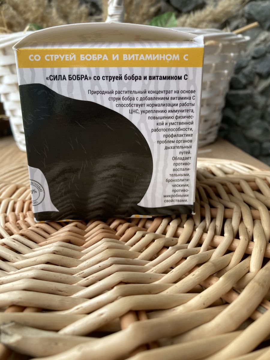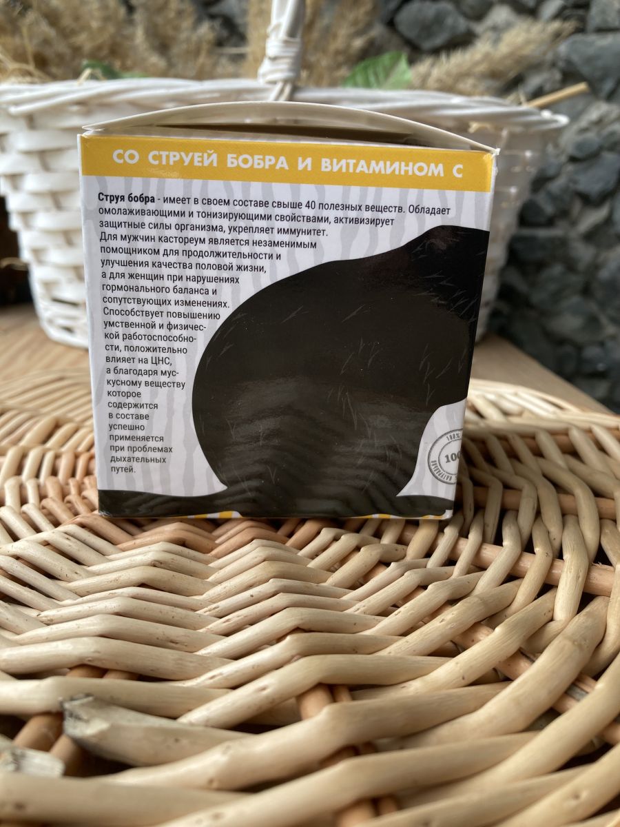 Природный растительный концентрат на основе струи бобра с добавлением витамина С способствует нормализации работы ЦНС, укреплению иммунитета, повышению физической и умственной работоспособности, профилактике проблем органов дыхательных путей. Обладает противовоспалительными, бронхолитическими, противомикробными свойствами. Струя бобра - Имеет в своем составе свыше 40 полезных веществ. Обладает омолаживающими и тонизирующими свойствами, активизирует защитные силы организма, укрепляет иммунитет. Для мужчин кастореум является незаменимым помощником для продолжительности и улучшения качества половой жизни, а для женщин при нарушениях гормонального баланса и сопутствующих изменениях. Способствует повышению умственной и физической работоспособности, положительно влияет на ЦНС, а благодаря мускусному веществу которое содержится в составе успешно применяется при проблемах дыхательных путей. Витамин С –Играет важную роль в регуляции окислительно-восстановительных процессов, является фактором защиты оранизма от последствий стресса, увеличивает устойчивость к инфекциям, мощный антиоксидант, регулирует свертываемость крови, нормализует проницаемость капилляров и обмен веществ.